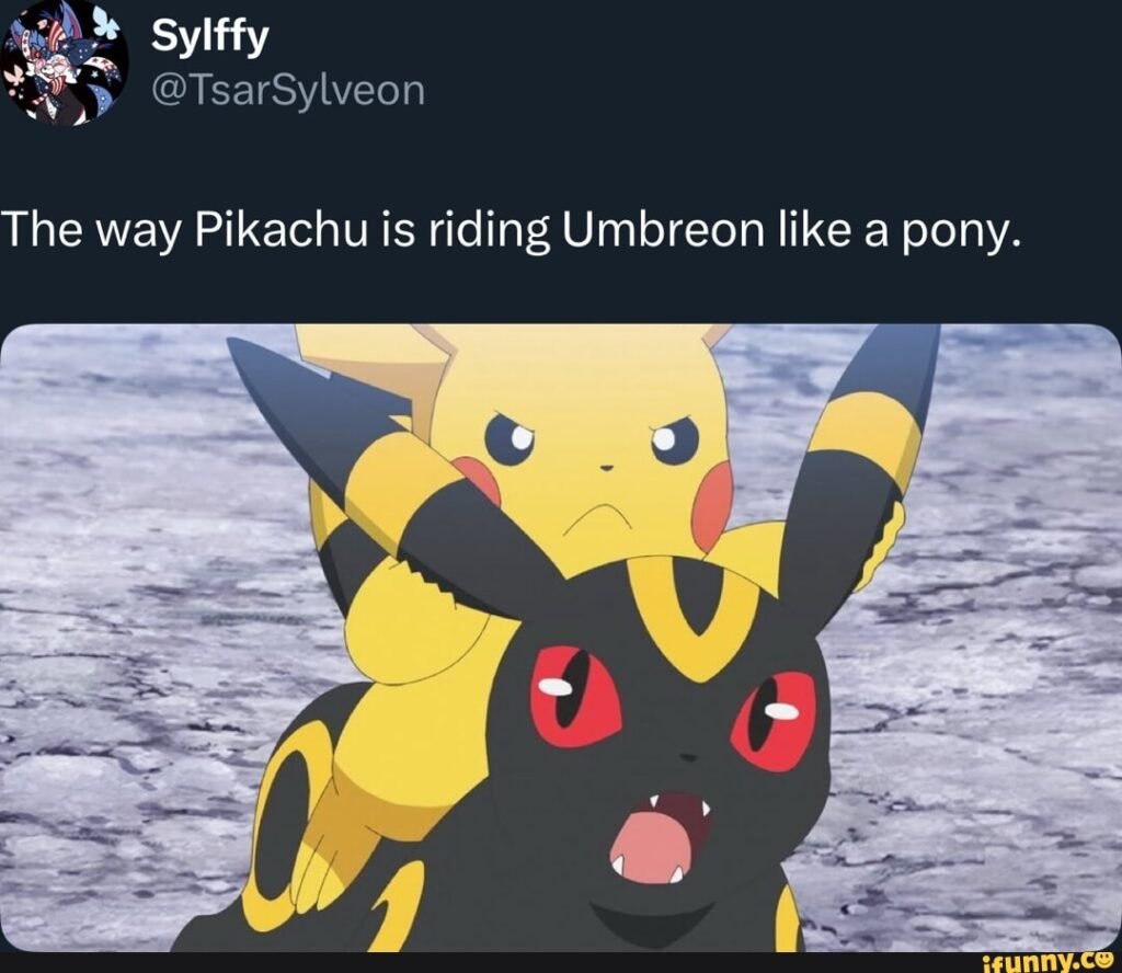 The way Pikachu is riding Umbreon like a pony. img.ifunny.co