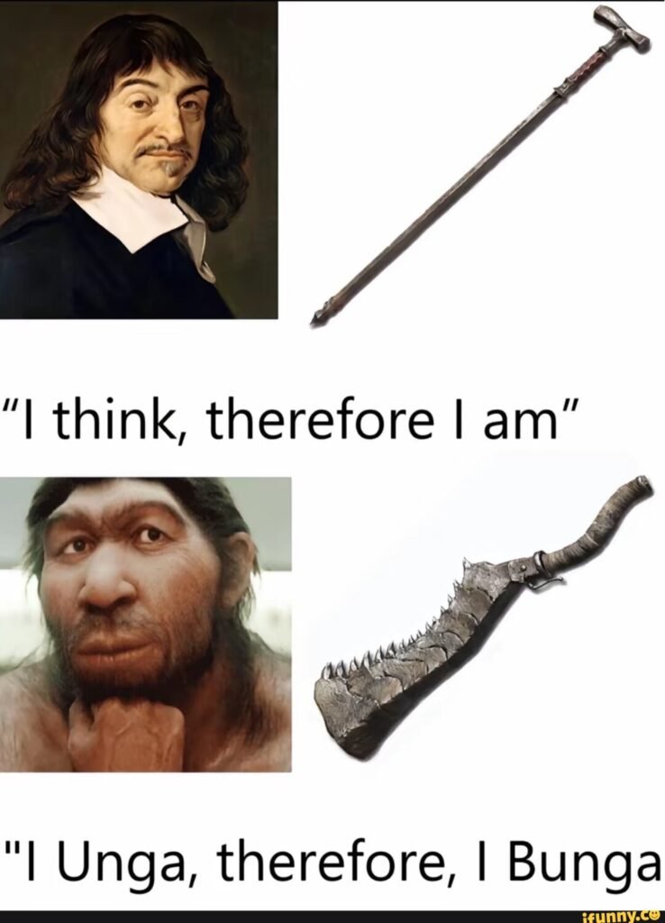 think, therefore I am" "I Unga, therefore, I Bunga img.ifunny.co 4 dada dudu 11 months ago in memes 0 think, therefore I am” “I Unga, therefore, I Bunga Facebook Twitter Pinterest votersdada duduNebinionAddictDarkInsightttATorrezReport Story Related Stories Women feel weak around men they are attracted to Every Monday! Educating the youth of today From ‘The Jetsons’ dreams to modern memes nebinioners hear me out… Care for a pint, mate? Feds accidentally publish secret plan to kill NYC congestion pricing Pizza Getting Delivered To…McDonald’s Phone charge fail Pyramid illusion Tags : funniestfypspongebobworld